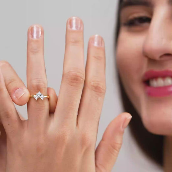 Add a touch of modern geometry to your hand with this chic Princess Trio Cluster Ring, designed for the stylish Indian woman who loves unique, architectural details. The ring features three brilliant princess-cut stones arranged in an artful, asymmetrical cluster, creating a contemporary and eye-catching silhouette. Crafted from high-quality 18K gold vermeil on 925 sterling silver, it is reliably anti tarnish and hypoallergenic, ensuring a comfortable and skin-friendly fit for all-day wear. This edgy yet minimal piece is perfect for elevating office wear or adding a distinct sparkle to your daily casual outfits, offering a fresh take on the classic sparkle.