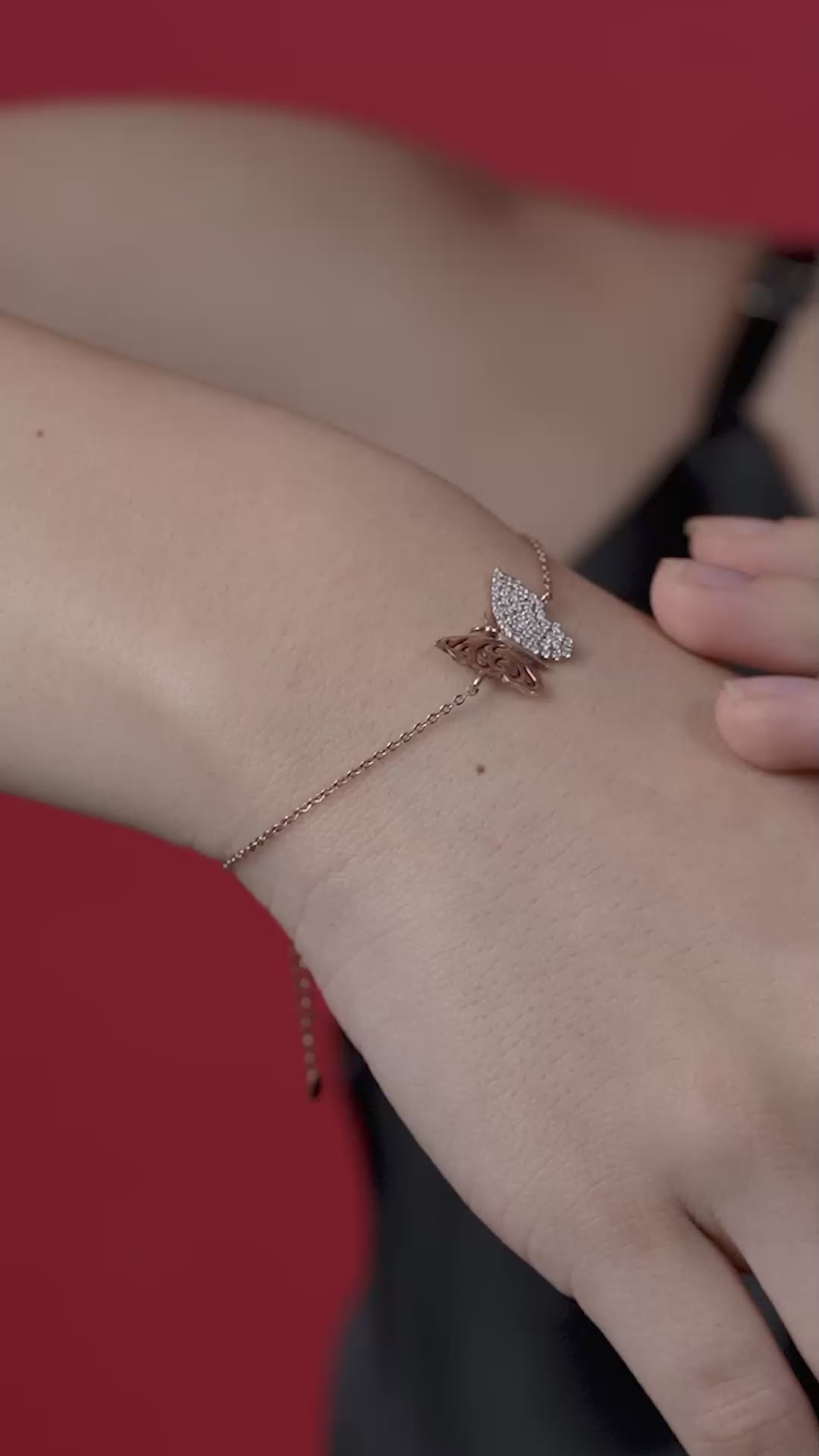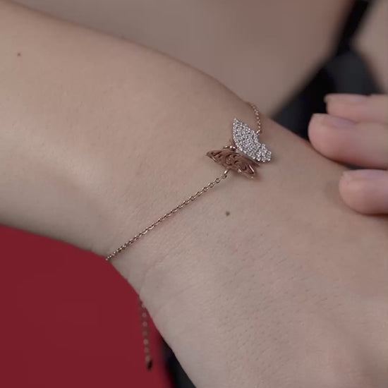 This is a gold bracelet with a delicate butterfly motif at the center.