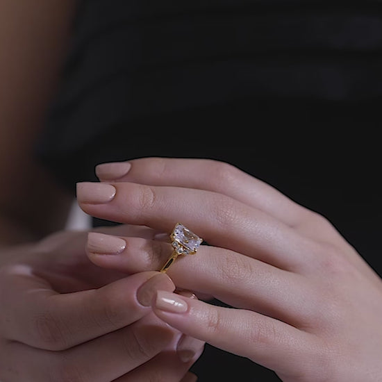 A radiant-cut diamond surrounded by a cluster of sparkling round stones on a polished gold band — a bold fusion of brilliance and luxury.