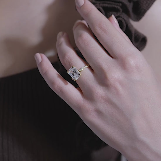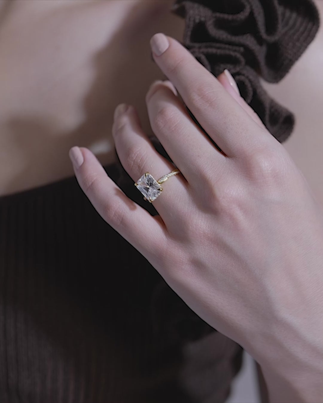 A dazzling radiant-cut diamond set on a graceful twisted gold band, combining modern design with timeless brilliance for effortless elegance.