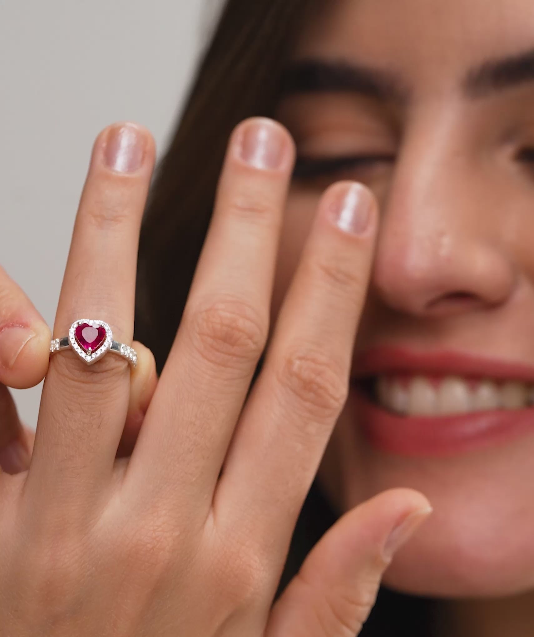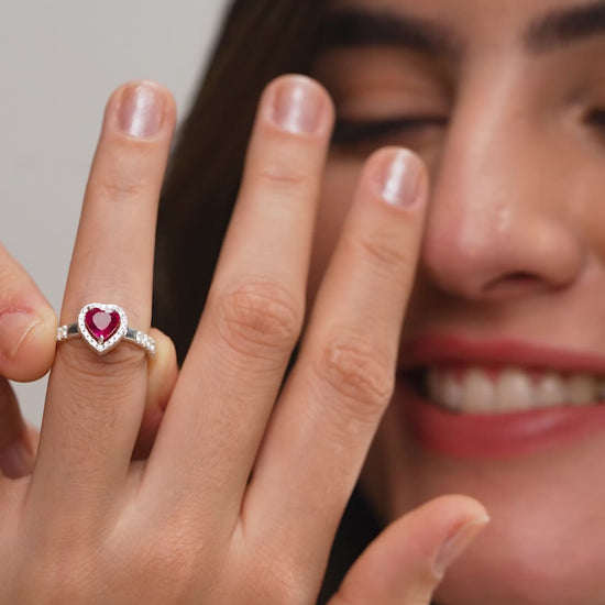 Romantic 18k gold vermeil ring featuring a brilliant red heart-shaped gemstone surrounded by a halo of sparkling cubic zirconia.
