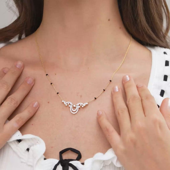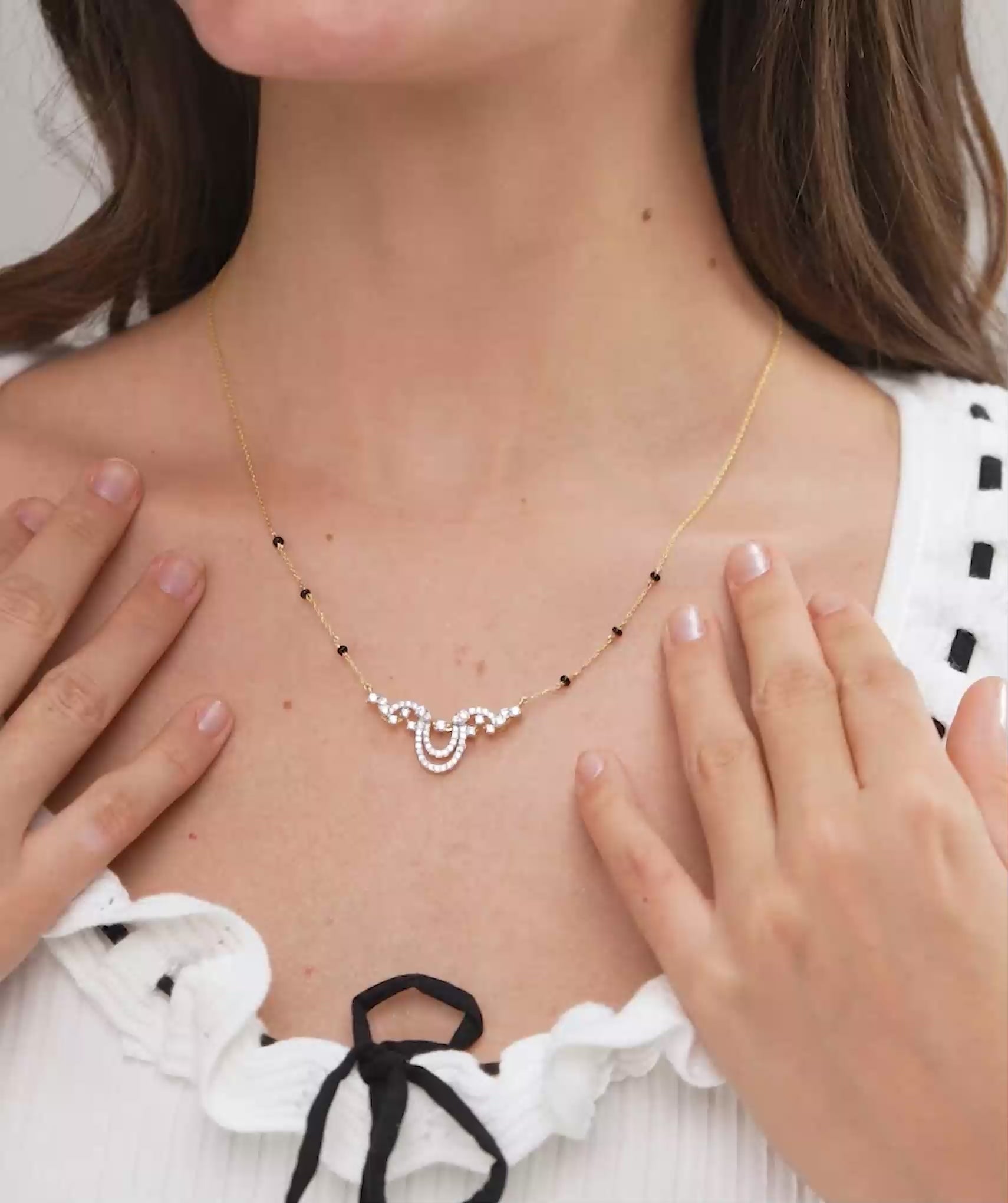 A timeless 18k gold vermeil mangalsutra featuring an intricate diamond-studded design, blending tradition with contemporary elegance for the modern bride.