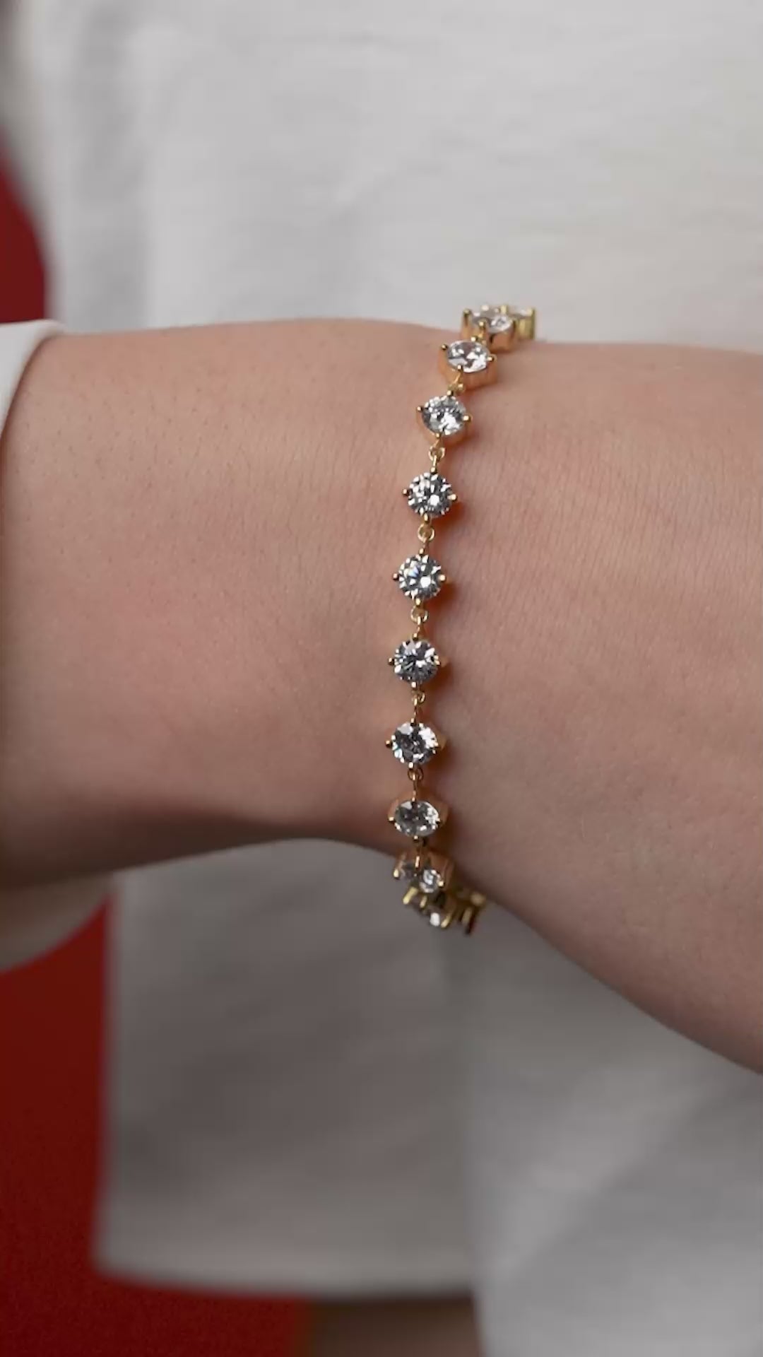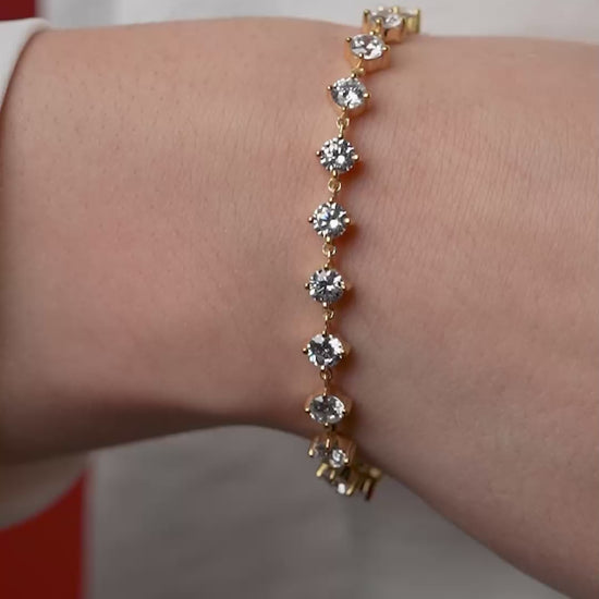 This is a classic gold tennis bracelet featuring a continuous line of round-cut white diamonds or diamonds in elegant four-prong settings.
