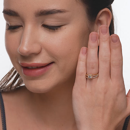 Elevate your intentional everyday gold look with this dazzling Round Halo Stack Ring, designed for the modern Indian woman who loves sophisticated glamour. This piece combines a brilliant round solitaire framed by a cushion-shaped pavé halo, paired seamlessly with a matching full pavé eternity band, offering a stunning, stylish, and highly elegant double-ring look. Crafted from high-quality 18K gold vermeil on 925 sterling silver, this set is reliably anti tarnish and hypoallergenic, ensuring a comfortable and luxurious fit for long-term wear. This eye-catching set is bold enough for party wear and special occasions, yet features a classic structure that makes it an effortlessly chic option for elevating office wear and sophisticated daily routines.
