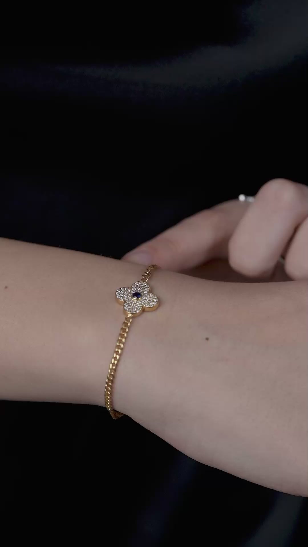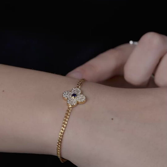 Luxurious 18k gold vermeil bracelet featuring a pavé crystal clover charm with a deep blue gemstone at its center.