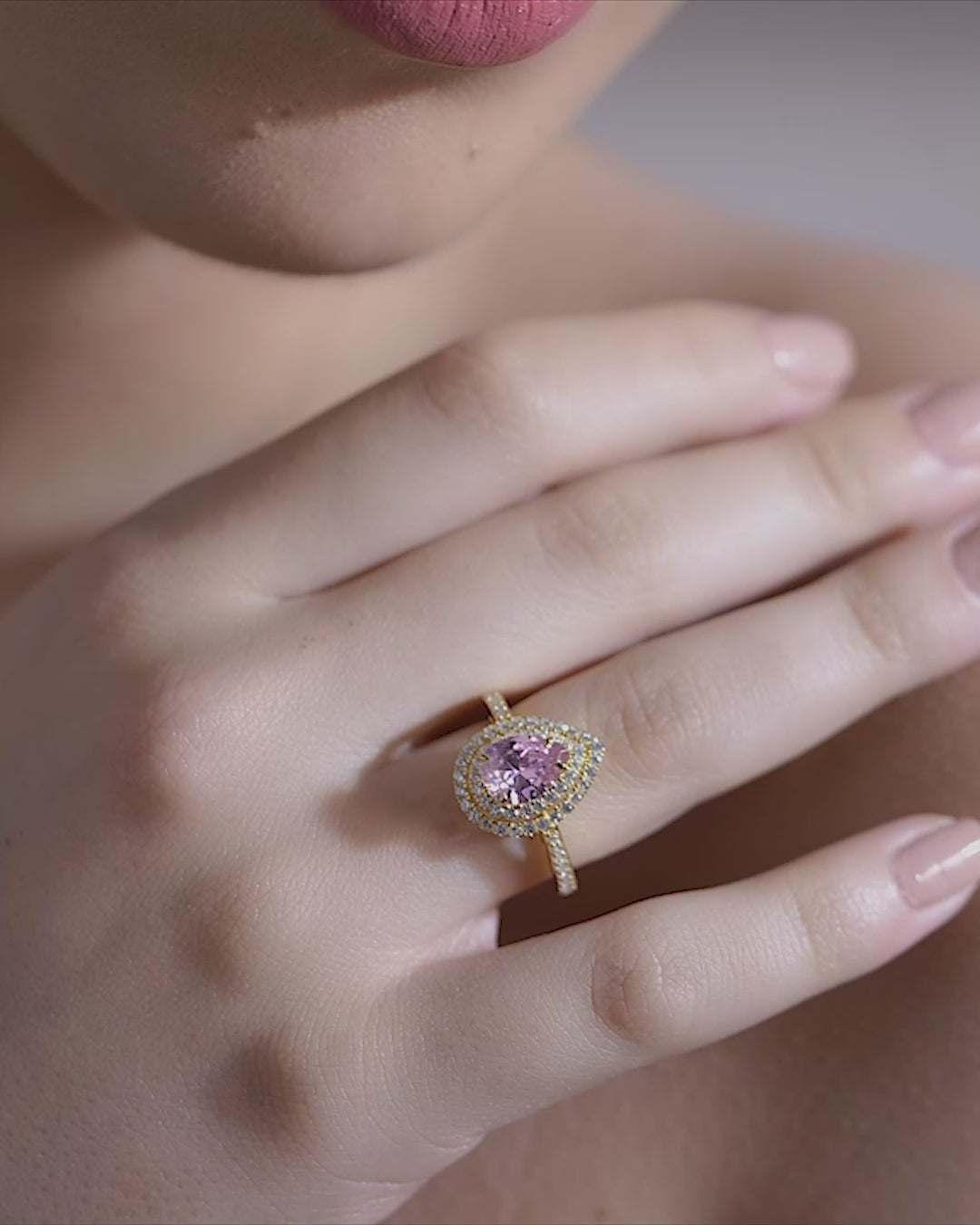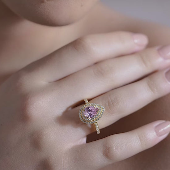 Make an unforgettable impression with this glamorous double halo ring, showcasing a stunning pear-shaped pink centre stone framed by two layers of brilliant, clear accents for maximum sparkle. This luxurious, elegant piece is designed for the modern Indian woman who loves a touch of colour and high glamour for party wear, weddings, or special date nights. Crafted using premium 18K gold vermeil on 925 sterling silver, this ring ensures a radiant gold finish that is both anti-tarnish and completely hypoallergenic. Comfortable and gentle on sensitive skin, this stylish gold ring offers statement-making luxury that you can wear confidently.