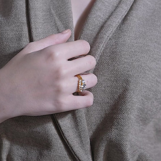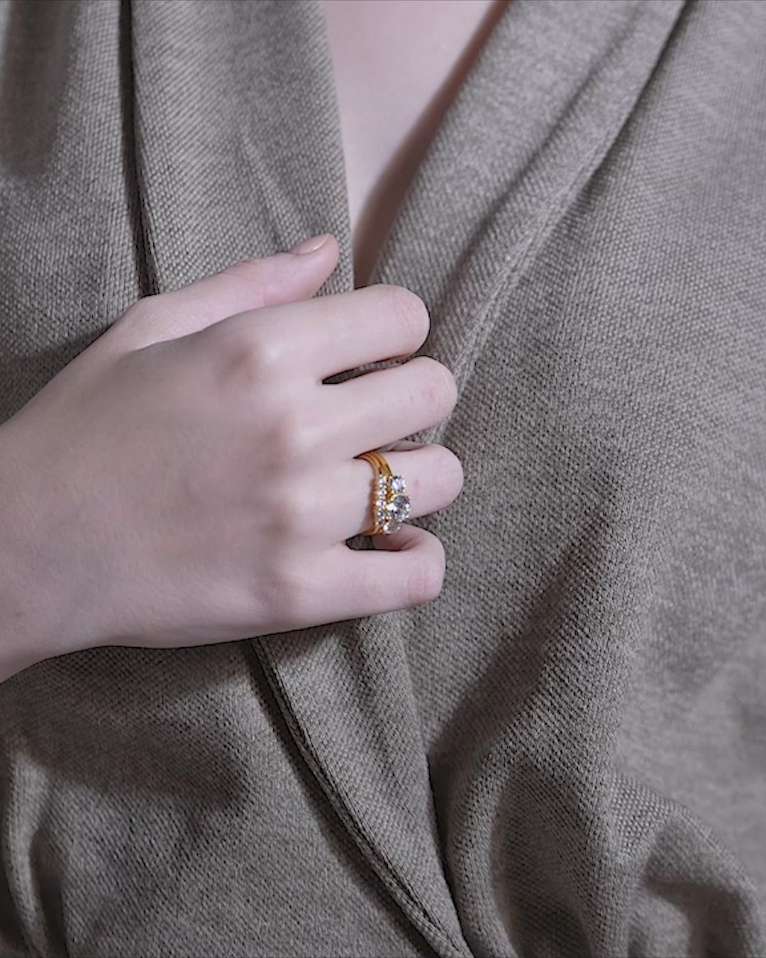 Embrace enduring elegance and intentional romance with this classic yet modern Three-Stone Solitaire Stacking Set, the pinnacle of Everyday Gold for the contemporary Indian woman. The centerpiece ring features a trio of brilliant round-cut stones—a large center stone flanked by two slightly smaller stones—symbolizing the Past, Present, and Future of your style journey. The set includes a perfectly contoured curved pave band designed to stack seamlessly against the solitaire, maximizing sparkle and creating a sophisticated, unified look. Ideal for an elevated office wear ensemble, glamorous party wear, or as a contemporary engagement set. Crafted using substantial 18K gold vermeil on 925 sterling silver, this set is completely anti tarnish and hypoallergenic, offering comfortable wear and a stunning, long-lasting glow that complements your intentional luxury aesthetic.