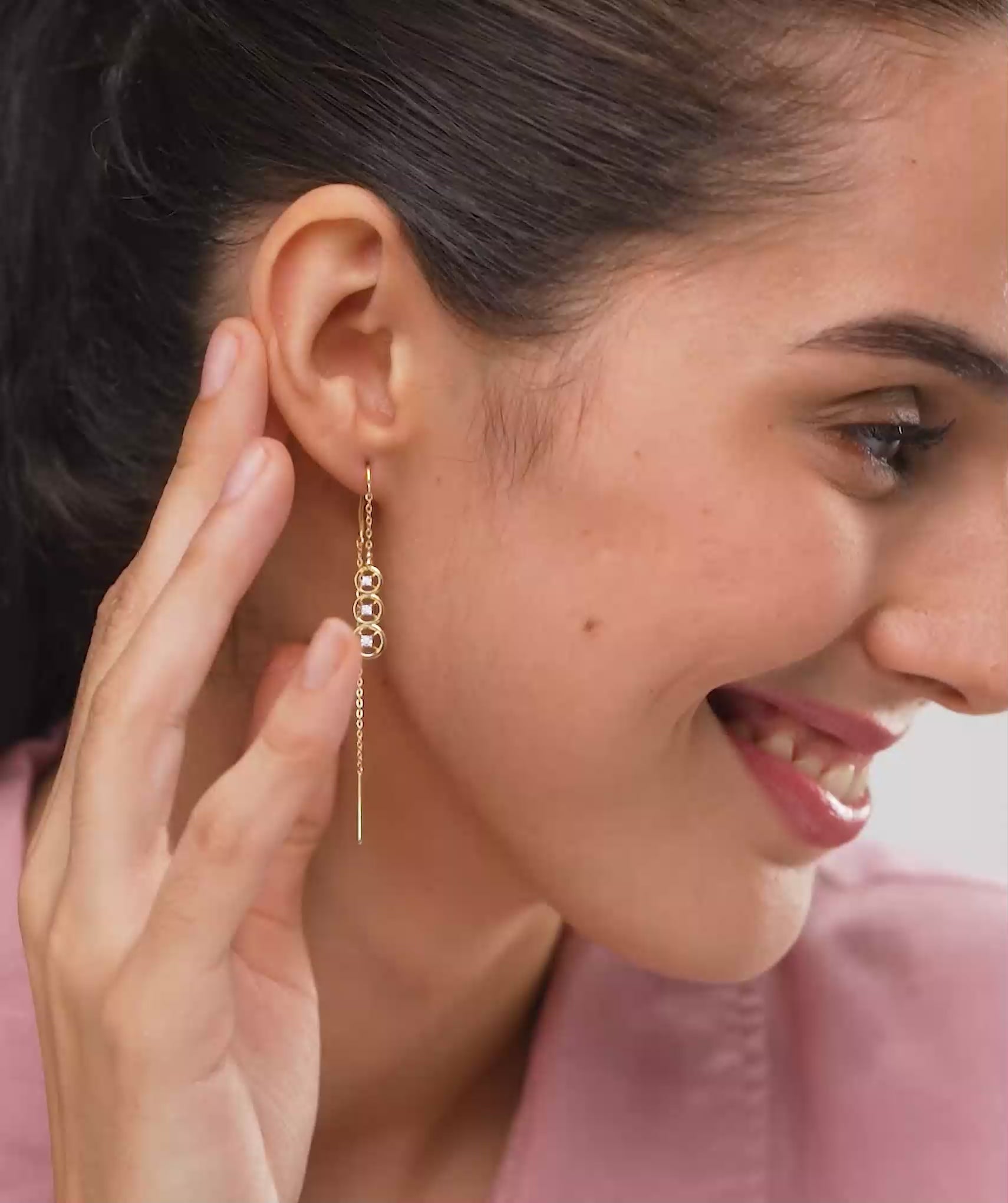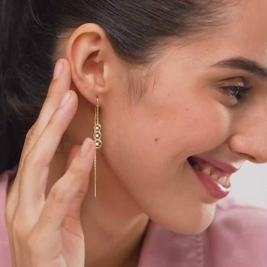 These are gold drop earrings featuring three interlinked circular motifs, each encasing a sparkling diamond at the center.