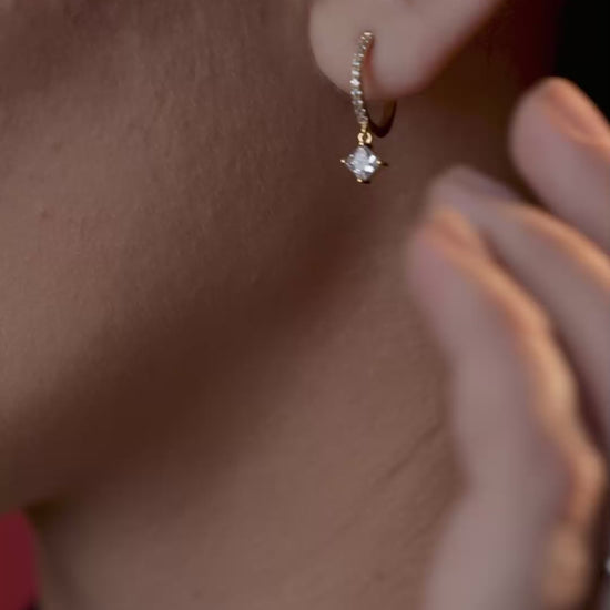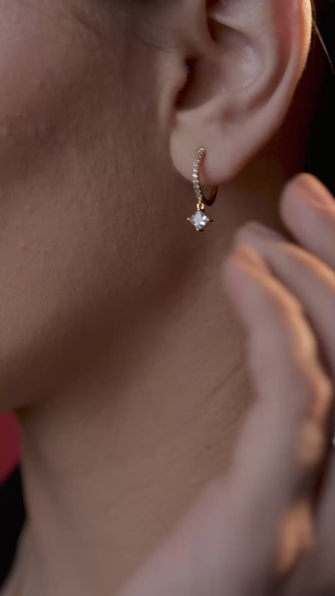 Elegant 18k Gold Vermeil hoop earrings with pavé diamonds and princess-cut dangle stones, adding timeless sparkle.