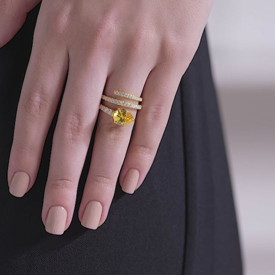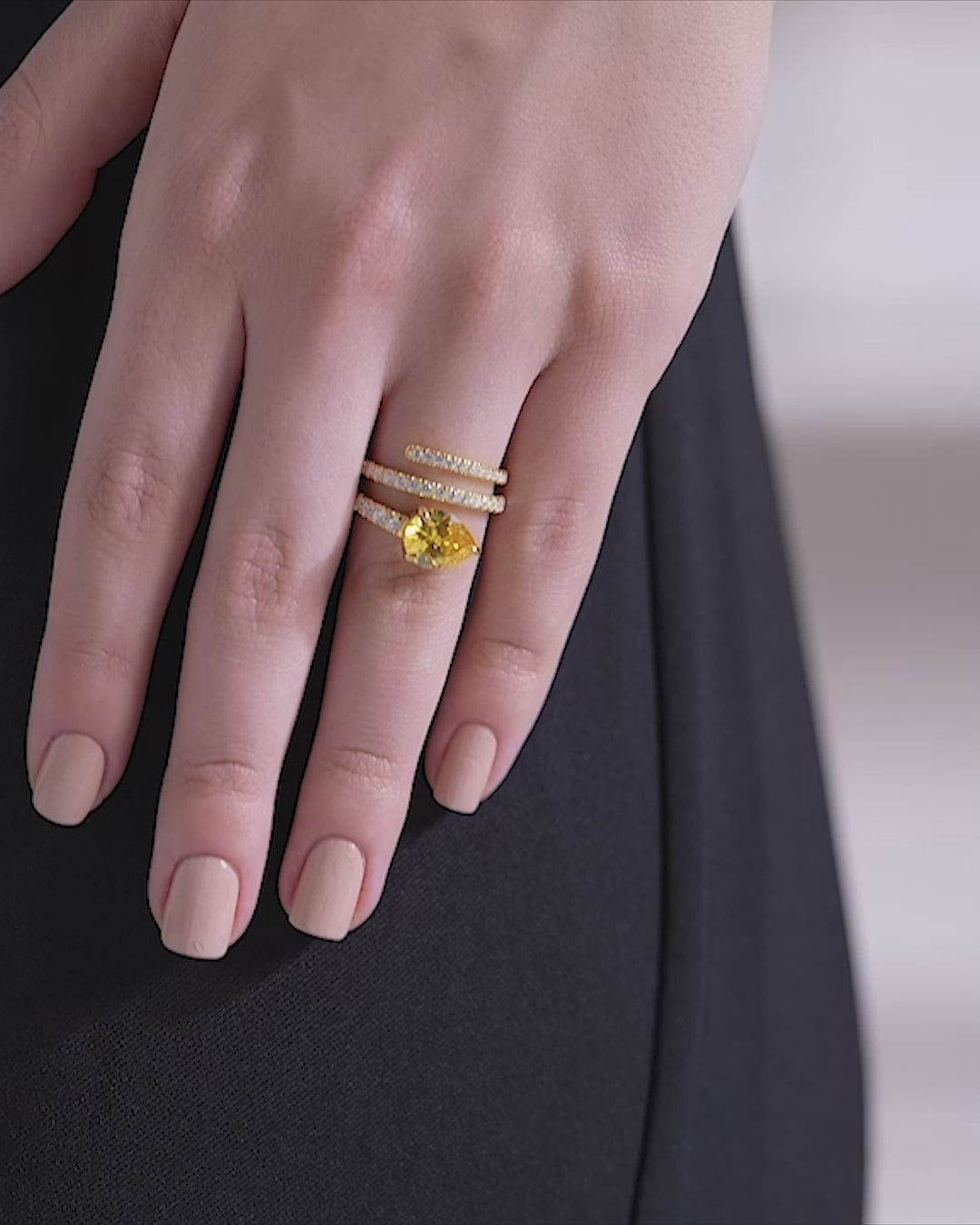 Ignite your evening look with this breathtaking Yellow Pear Spiral Statement Ring. The unique coiled design wraps elegantly around your finger, showcasing a vibrant yellow pear-cut stone contrasted against a band fully paved with sparkling crystals. Crafted in 18K gold vermeil on 925 sterling silver, it is anti-tarnish and hypoallergenic, offering a luxurious feel without irritating sensitive skin. Perfect for modern Indian women attending cocktail parties or festive celebrations, this bold piece ensures you stand out with sophistication and comfort.